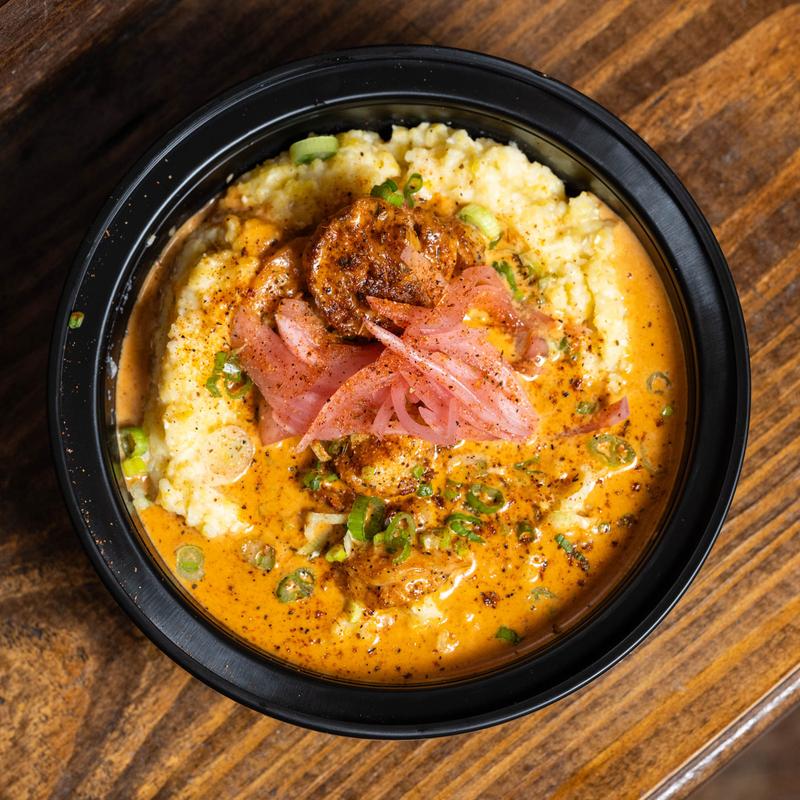 Savory grilled shrimp over creamy housemade grits topped with cajun creme sauce, green onions, & pickled onions.