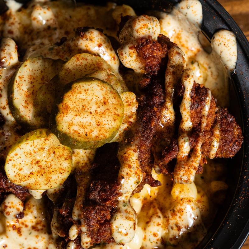 Nashville hot style chicken on top of our creamy mac & cheese, topped with ranch & pickles.