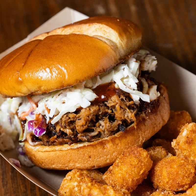 Smoked pork BBQ, crispy coleslaw, housemade BBQ sauce, & pickles on a toasted bun.