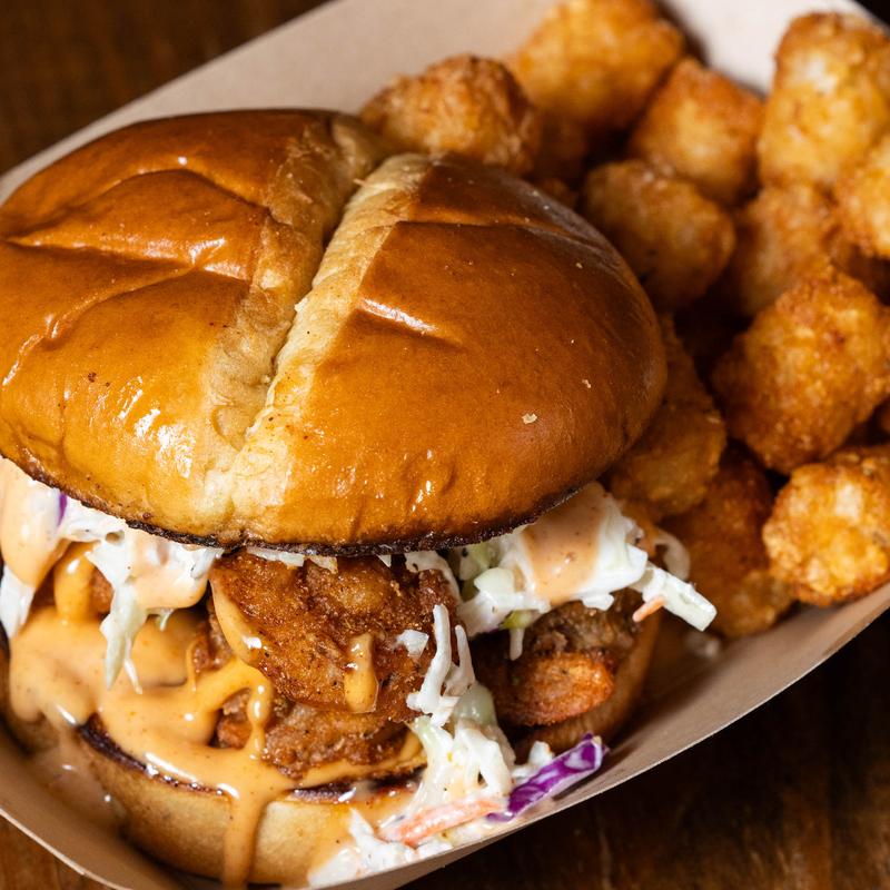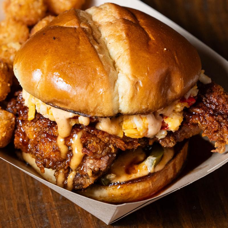 Fried chicken on a toasted bun topped with pimento cheese, hot honey, jalapeno relish, and served with tots.