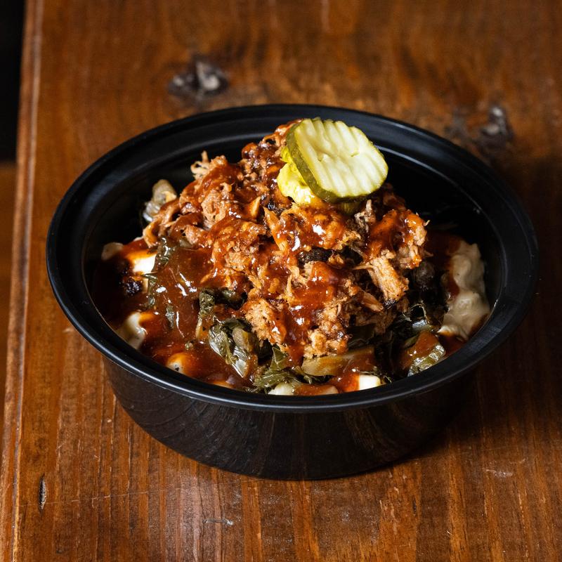 Smoked pork BBQ over a bed of mac & cheese, collard greens, topped with housemade BBQ sauce & pickles.