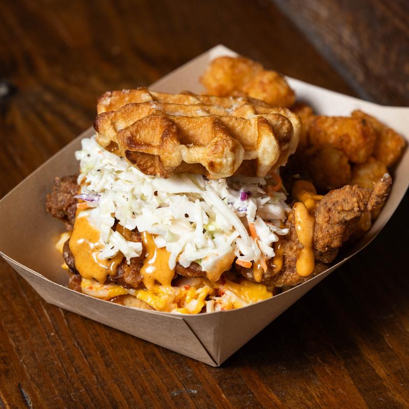 Hand-breaded chicken, crisp coleslaw, & pimento cheese topped with our special comback sauce on two waffles.