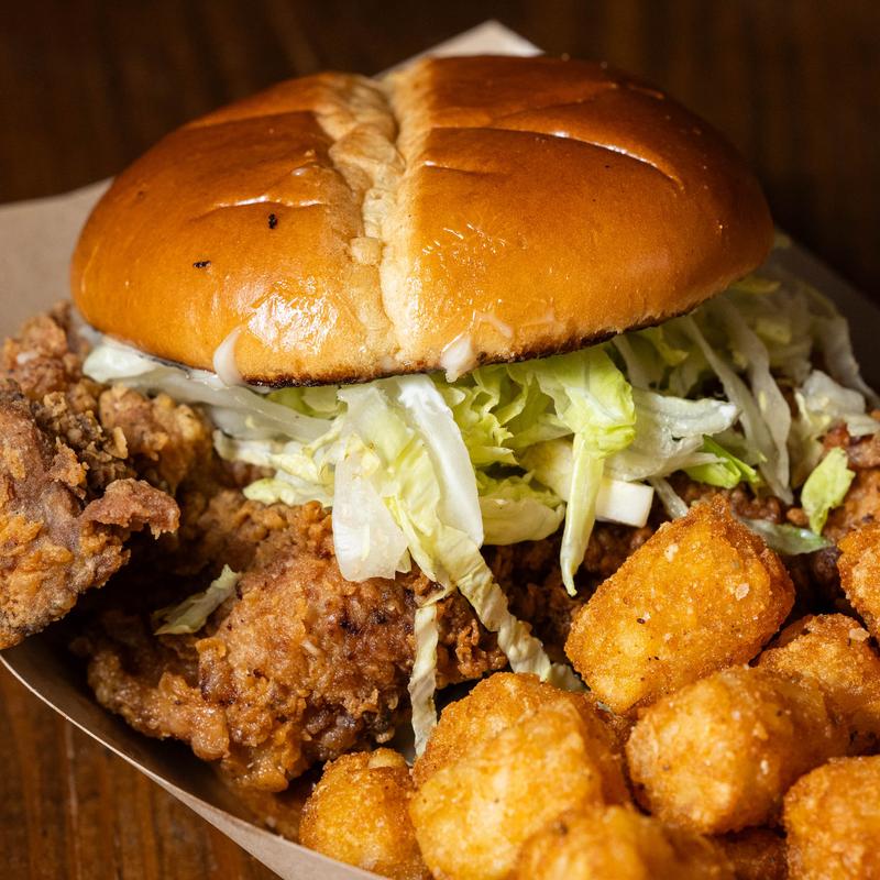 Fried chicken on a toasted bun topped with Duke's mayo and lettuce, and served with tots.